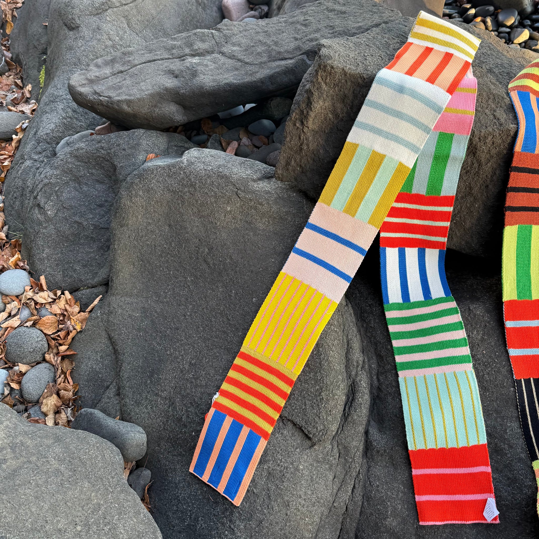 A vintage-inspired long skinny scarf knitted with a patchwork mix of two-tone stripes. Colorful, reversible, and unisex. For indoor and outdoor wear. Can be tied and wrapped in many different ways depending on weather or mood. Knit with new and repurposed deadstock yarn.