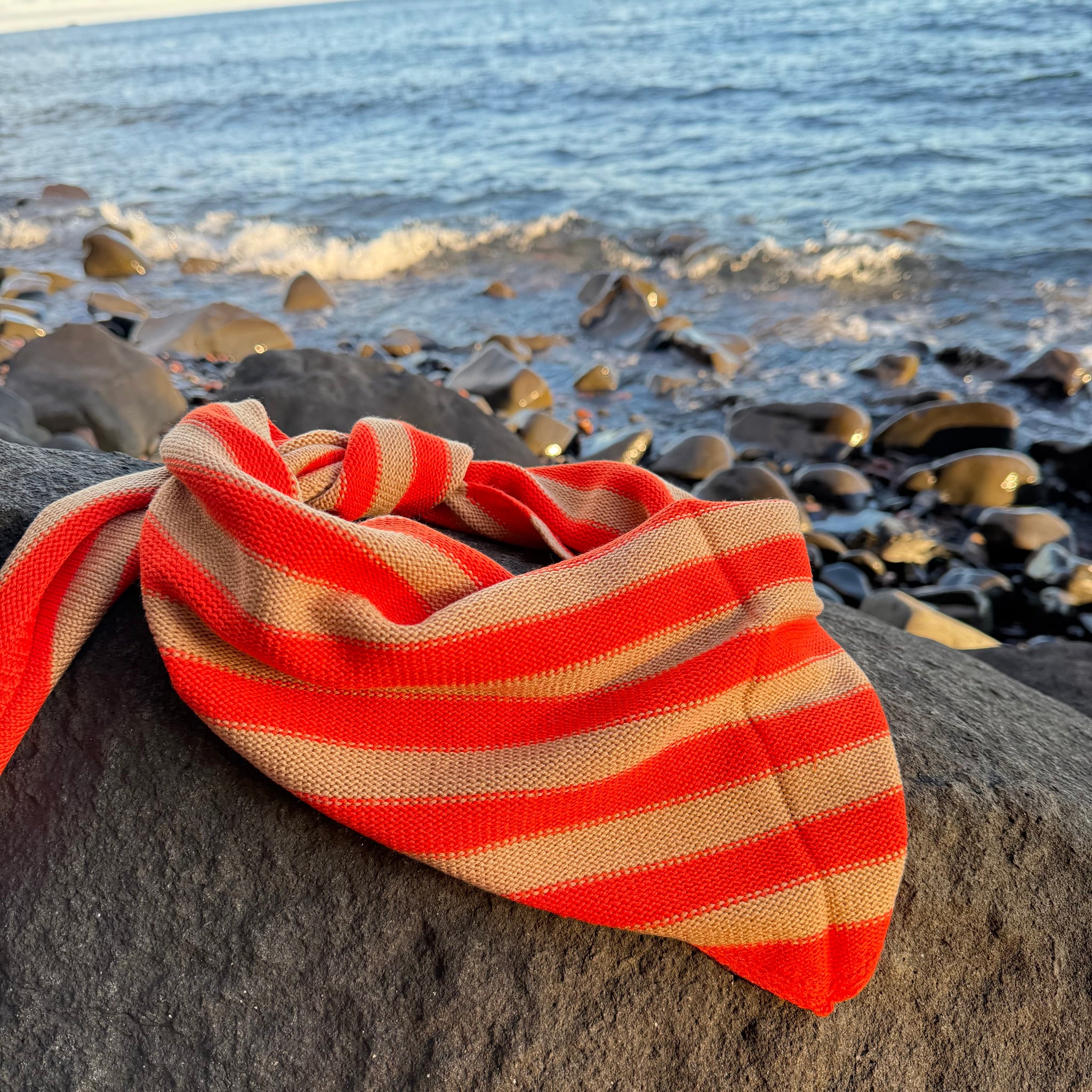 Soft, versatile triangle scarf with two-tone simple striping. Wear it knotted or tied as a neckerchief, shawl, or bandana. Perfect for transitional outfits, indoors and out. Knit with hypoallergenic yarn.