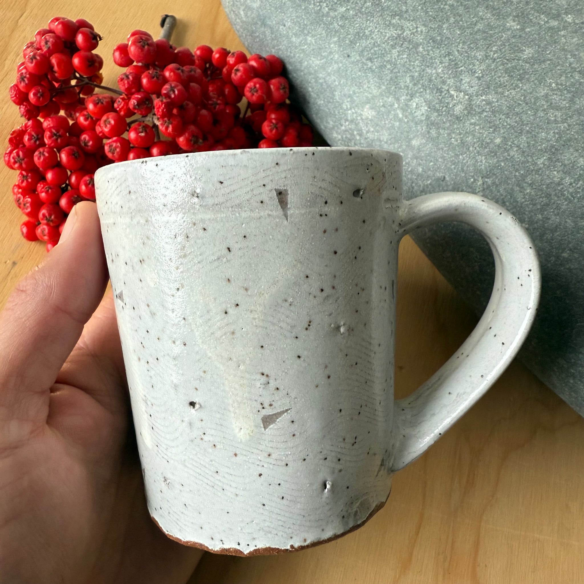 What a way to start your morning! An upright wonder to hold your java or tea. Perfect handle for those who enjoy "hooking in" to your morning cuppa.