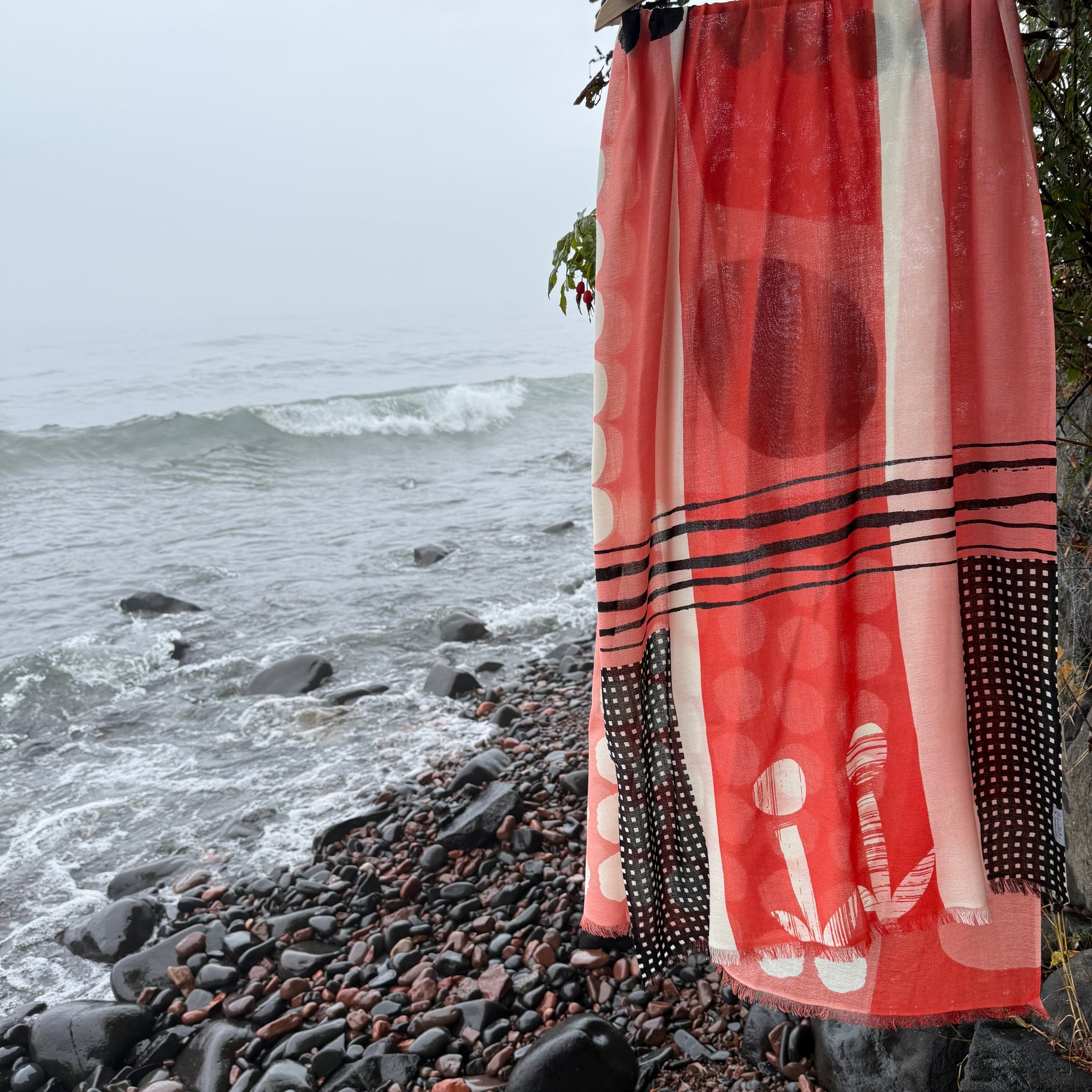 Banjo is a melody in fabric - lyrical and zesty. It is handprinted on delightful merino wool and offers a harmonious blend of comfort and style. The airy, open weave and the captivating Rivera color palette make it the ideal accessory for your summer wardrobe.