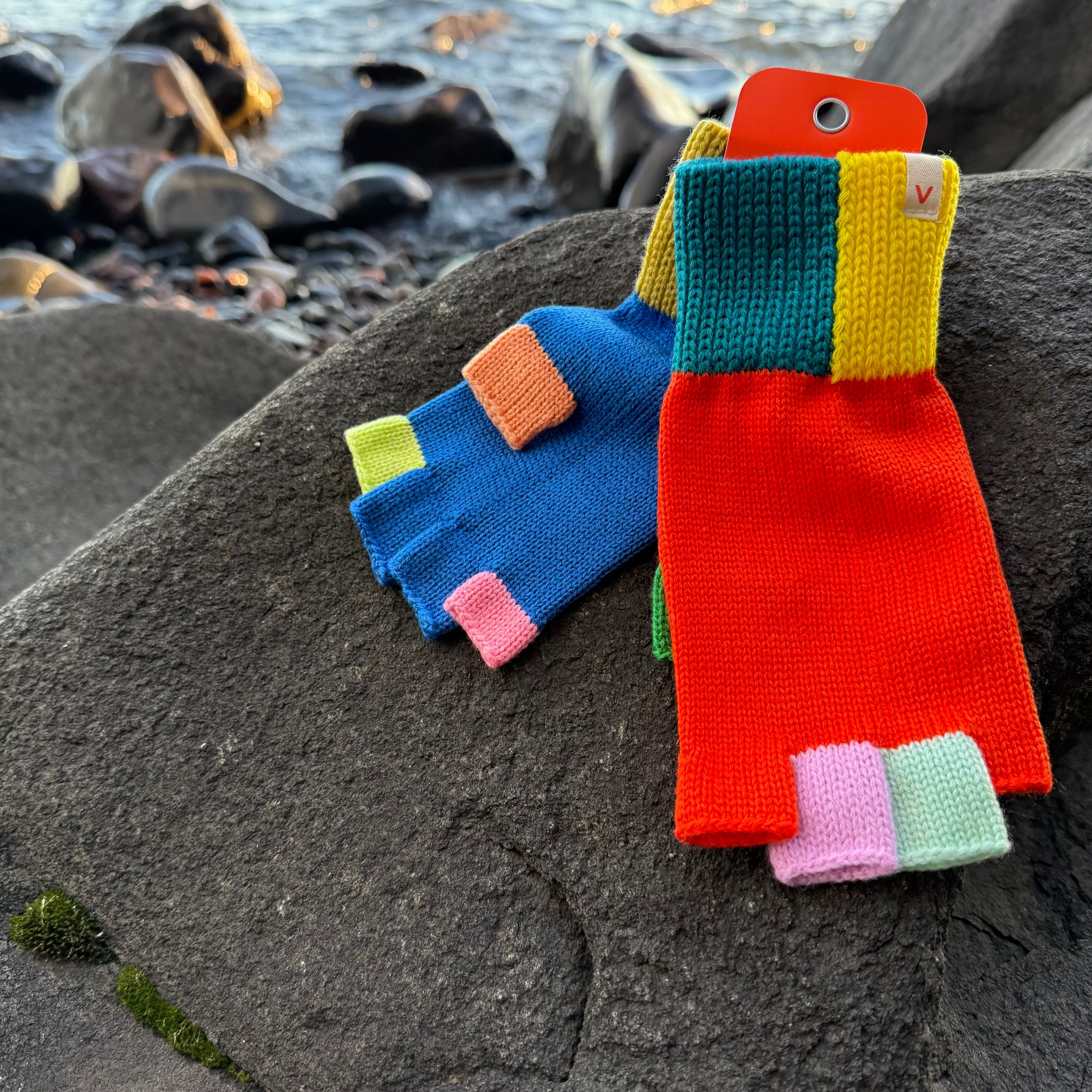 DETAILS Soft fingerless knit gloves. Perfect for fall days, driving, or anytime you want to stay warm but keep your fingertips free. Colorful plaited stripes with contrasting ribbed cuff designed to keep out the cold. Make it a matching set (or the perfect gift) with our oversized striped scarf.