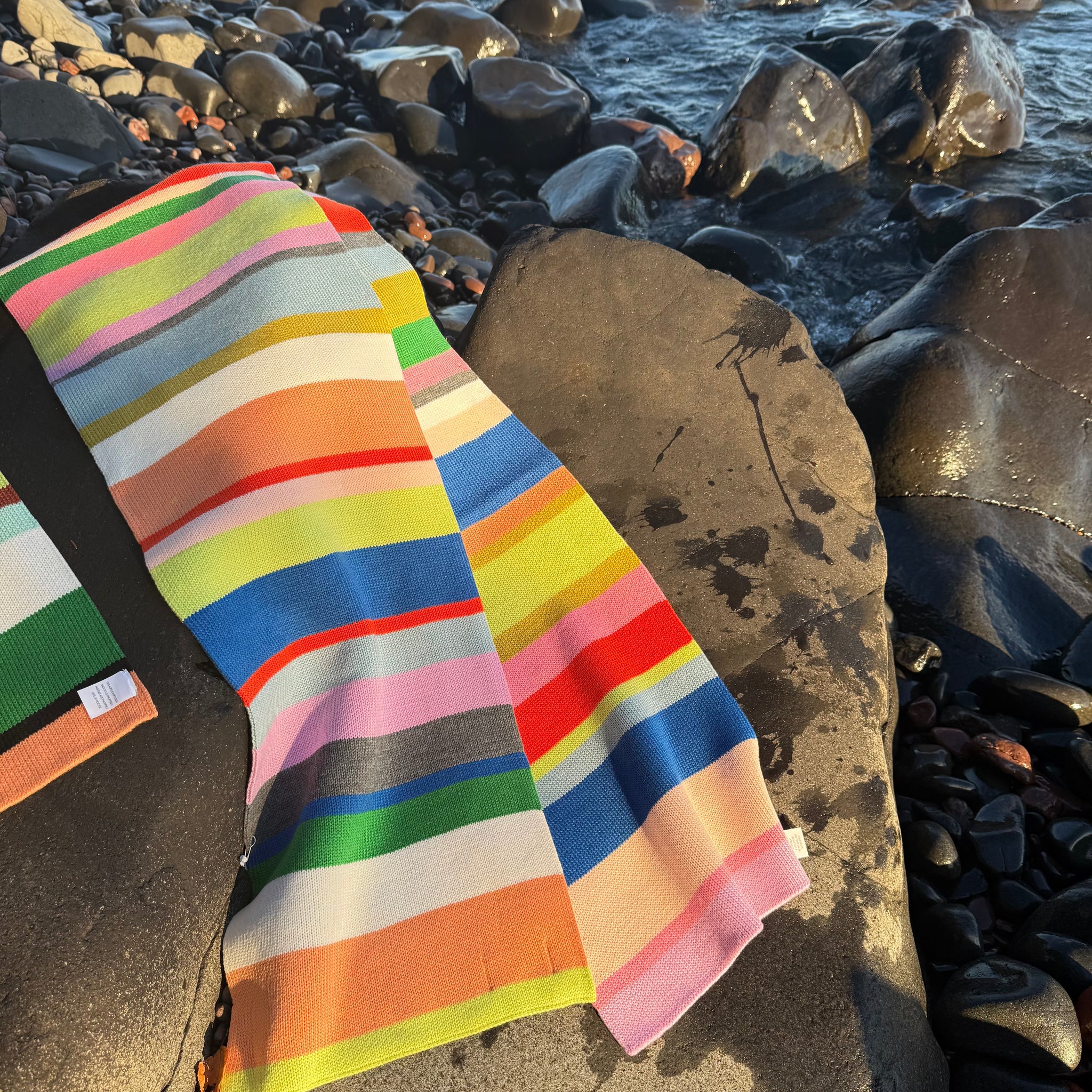 Oversized, soft jacquard knit scarf with a bold, asymmetrical stripe pattern. Layer on the color with this big, comfy, cozy scarf all fall and winter long. Can be worn long or wrapped up like a cowl for extra warmth. Fully reversible. Made with hypoallergenic yarn.