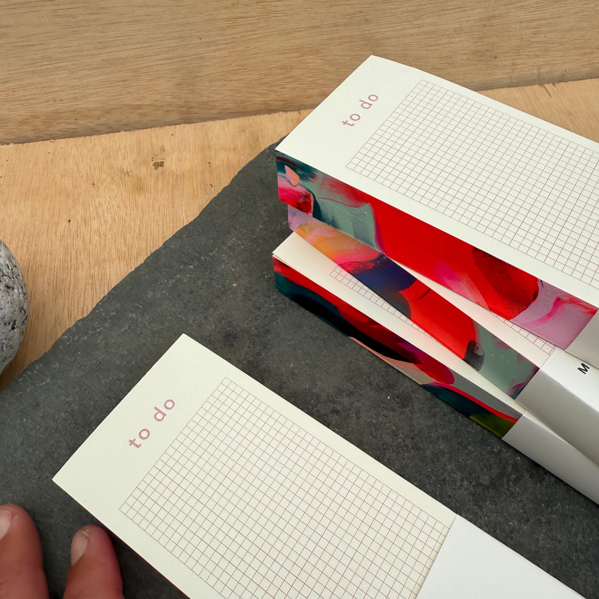 Notepad with one-of-a-kind swirl painted gummed edge. Each pad is expertly hand-painted, padded, and assembled in our studio.